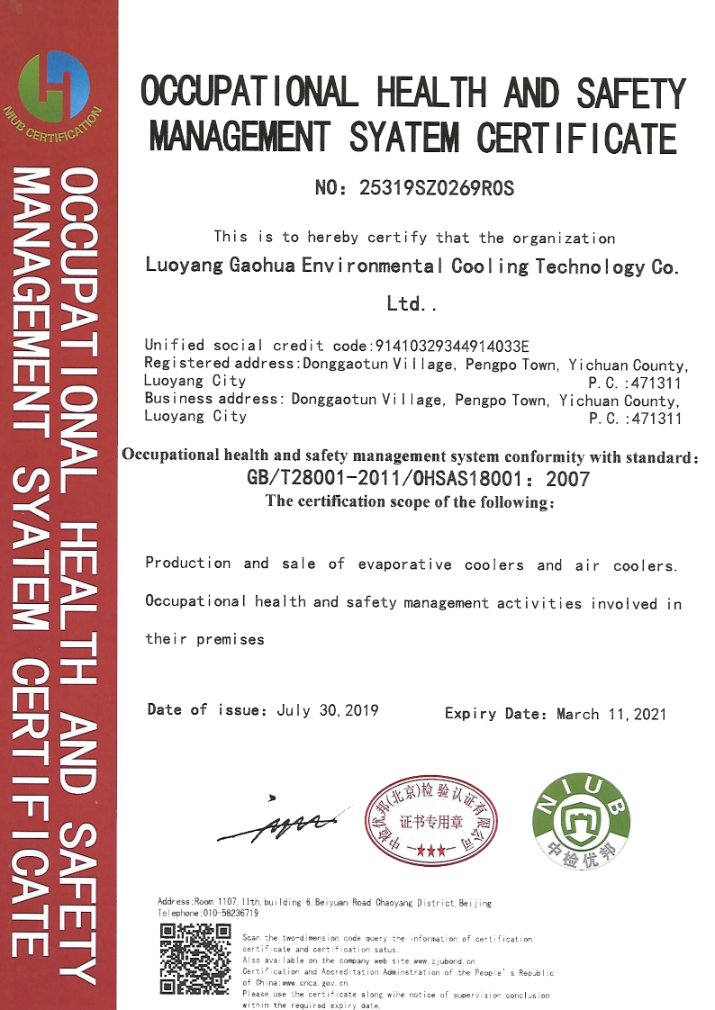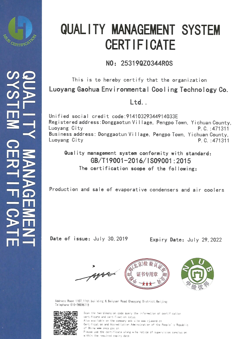 在洛陽(yáng)高華環(huán)保公司全體員工及合作伙伴的不懈努力下,經(jīng)過(guò)認(rèn)證公司專家的***、嚴(yán)格、細(xì)致的指導(dǎo)和審核,確認(rèn)洛陽(yáng)高華環(huán)保冷卻科技有限公司的蒸發(fā)式冷卻(凝)設(shè)備、空冷器的生產(chǎn)和銷售的質(zhì)量管理體系符合:GB/T19001-2016/ISO9001:2015 標(biāo)準(zhǔn)的要求,并于2019年7月30日,向洛陽(yáng)高華環(huán)保冷卻科技有限公司正式頒發(fā)了ISO9001質(zhì)量管理體系認(rèn)證證書。