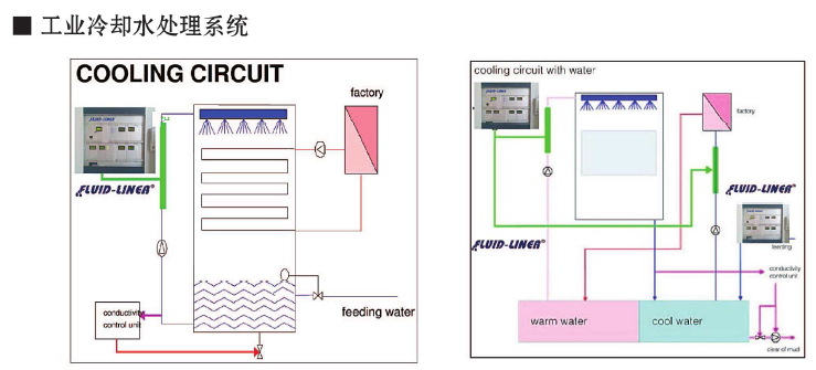 FLUID-LINER 主要應用領域是對生產用水的處理。重 點是對鍋爐、換熱器、冷卻塔、水泵、管道、閥門、噴嘴以及與水接觸的設備表面的有效保護,免遭礦物結垢現象。